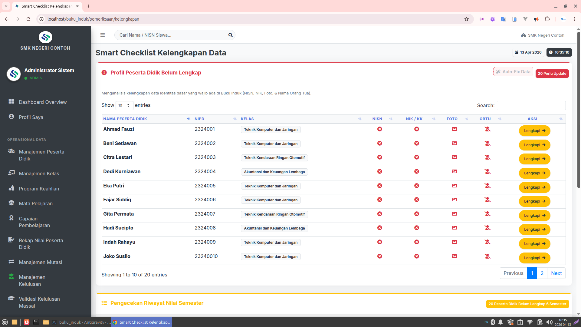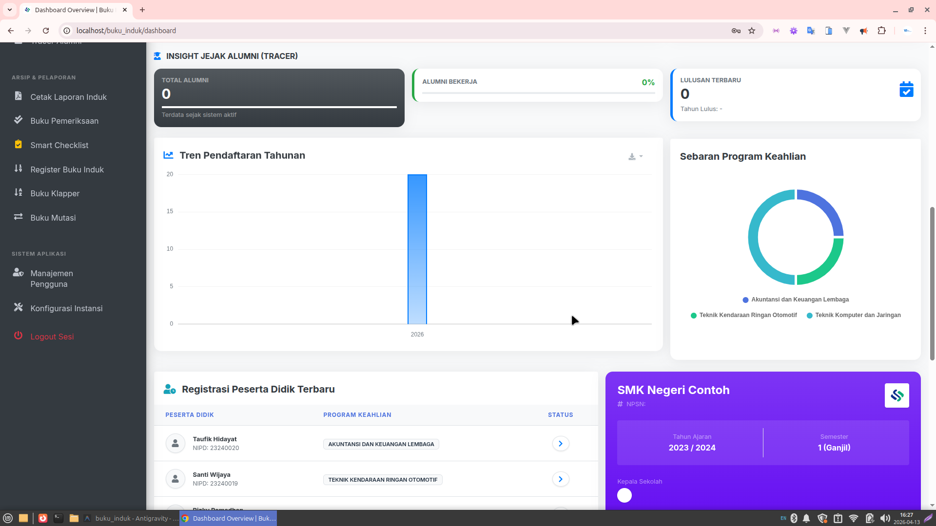 Dashboard Analitik: Visualisasi real-time untuk total peserta didik, sebaran per jurusan, dan log pemeriksaan buku induk.
