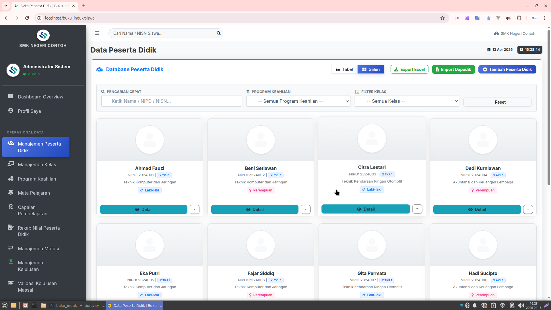 Sinkronisasi Dapodik: Integrasi parser Excel Dapodik yang cerdas untuk memetakan Identitas, Alamat, Orang Tua, hingga data Rombel secara otomatis.