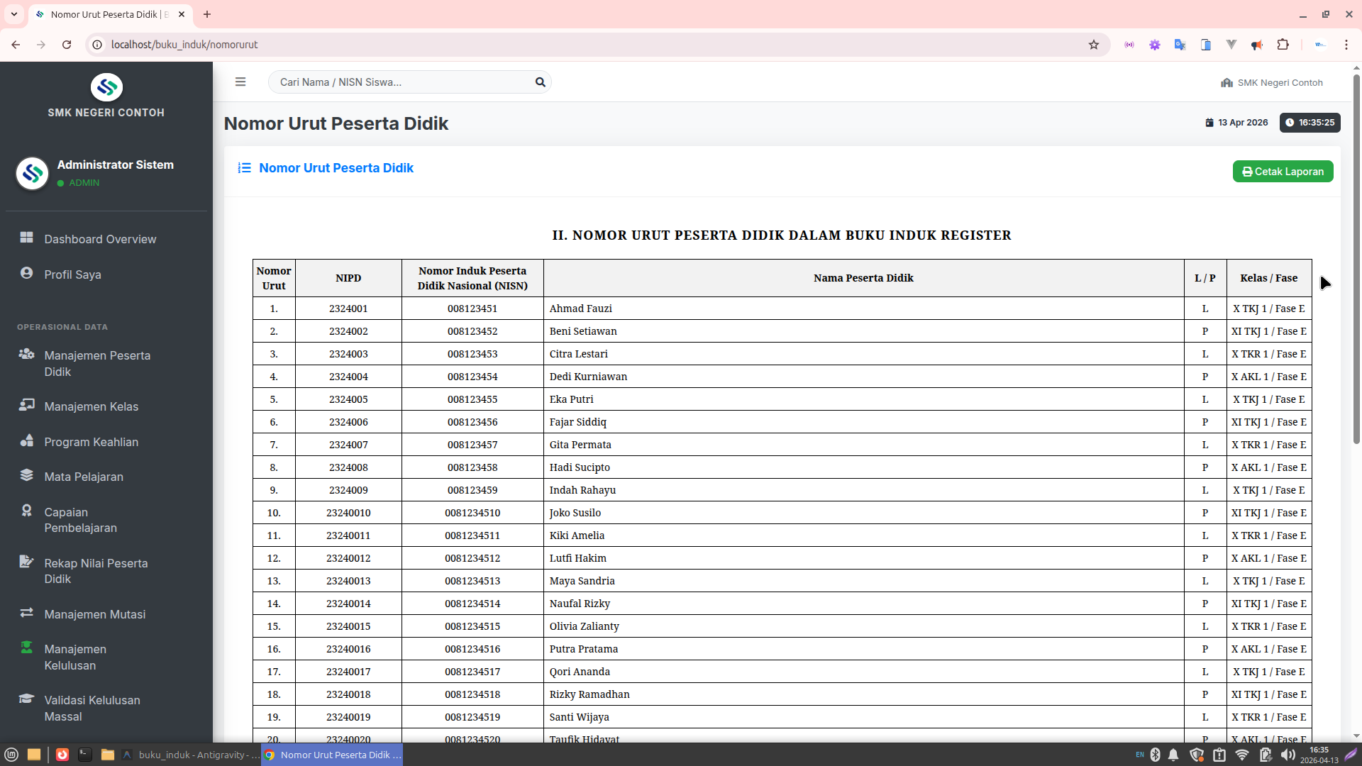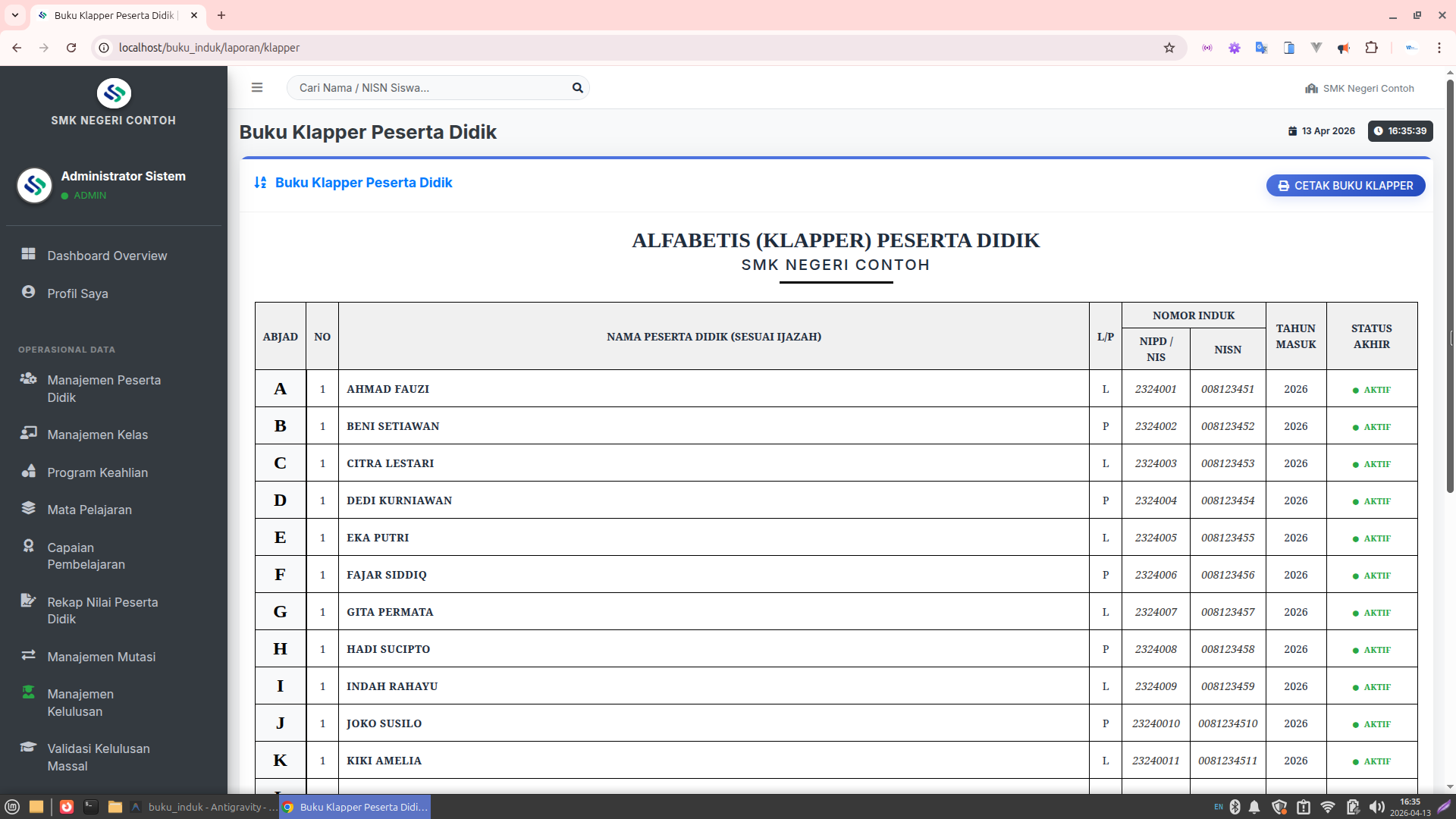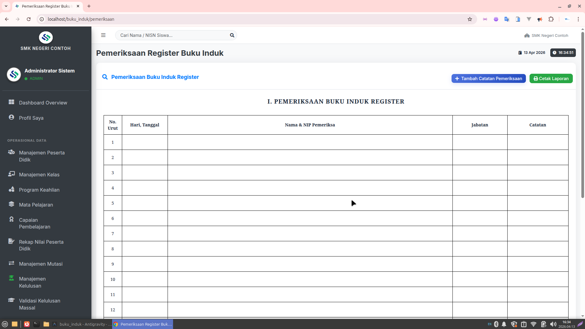 Lembar Buku Induk (Register): Format layout yang identik dengan buku manual resmi.