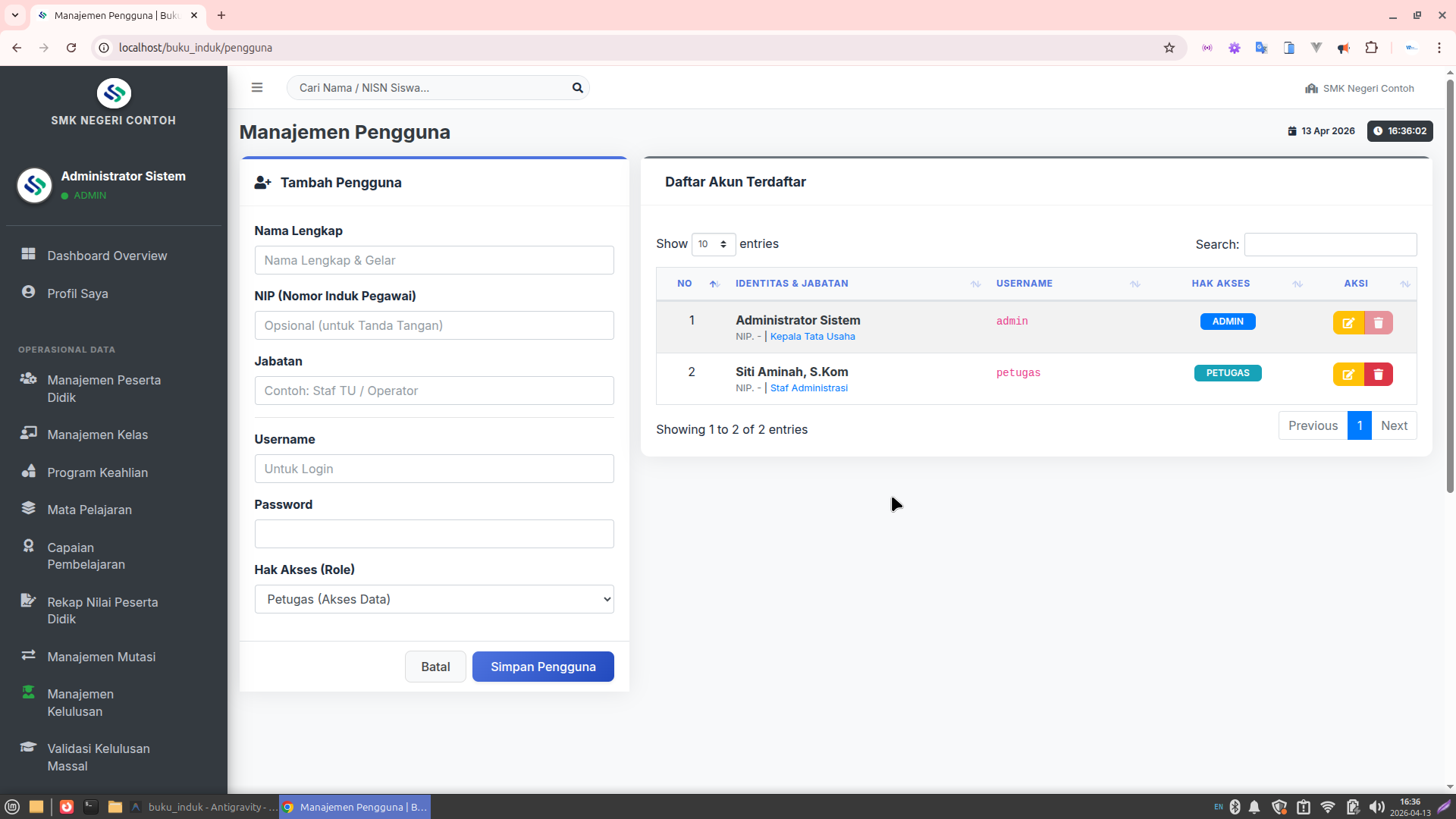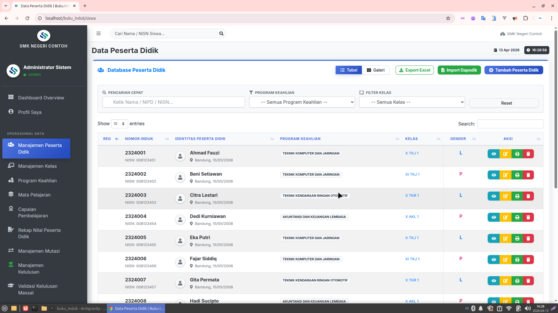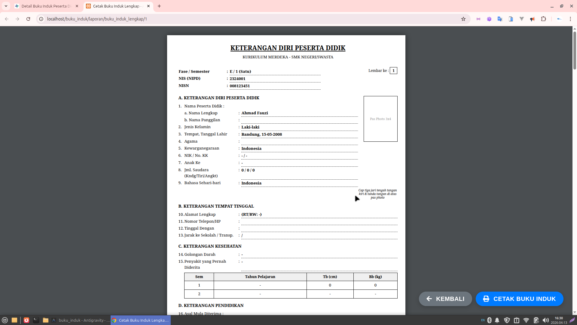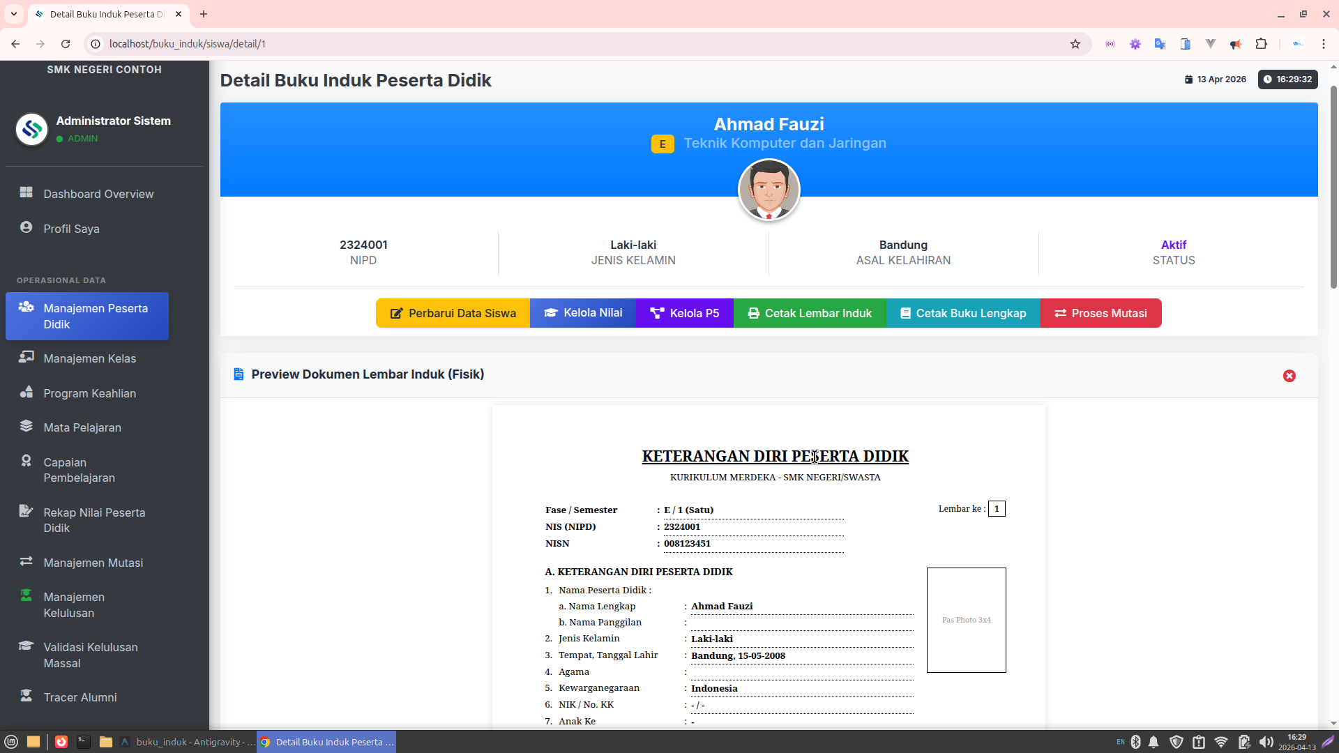 Lembar Buku Induk (Register): Format layout yang identik dengan buku manual resmi.