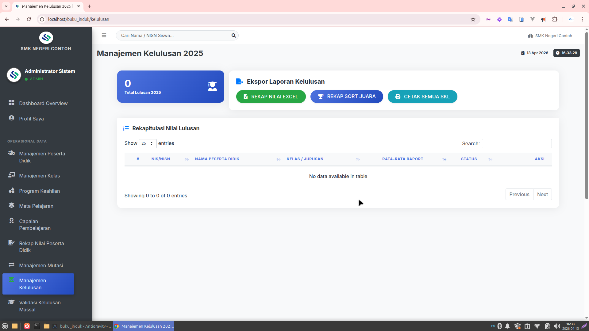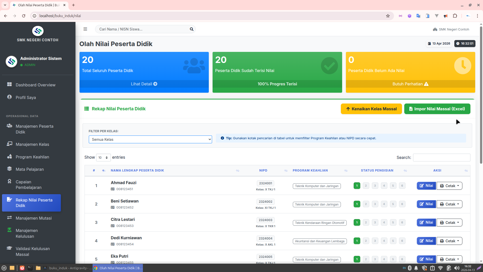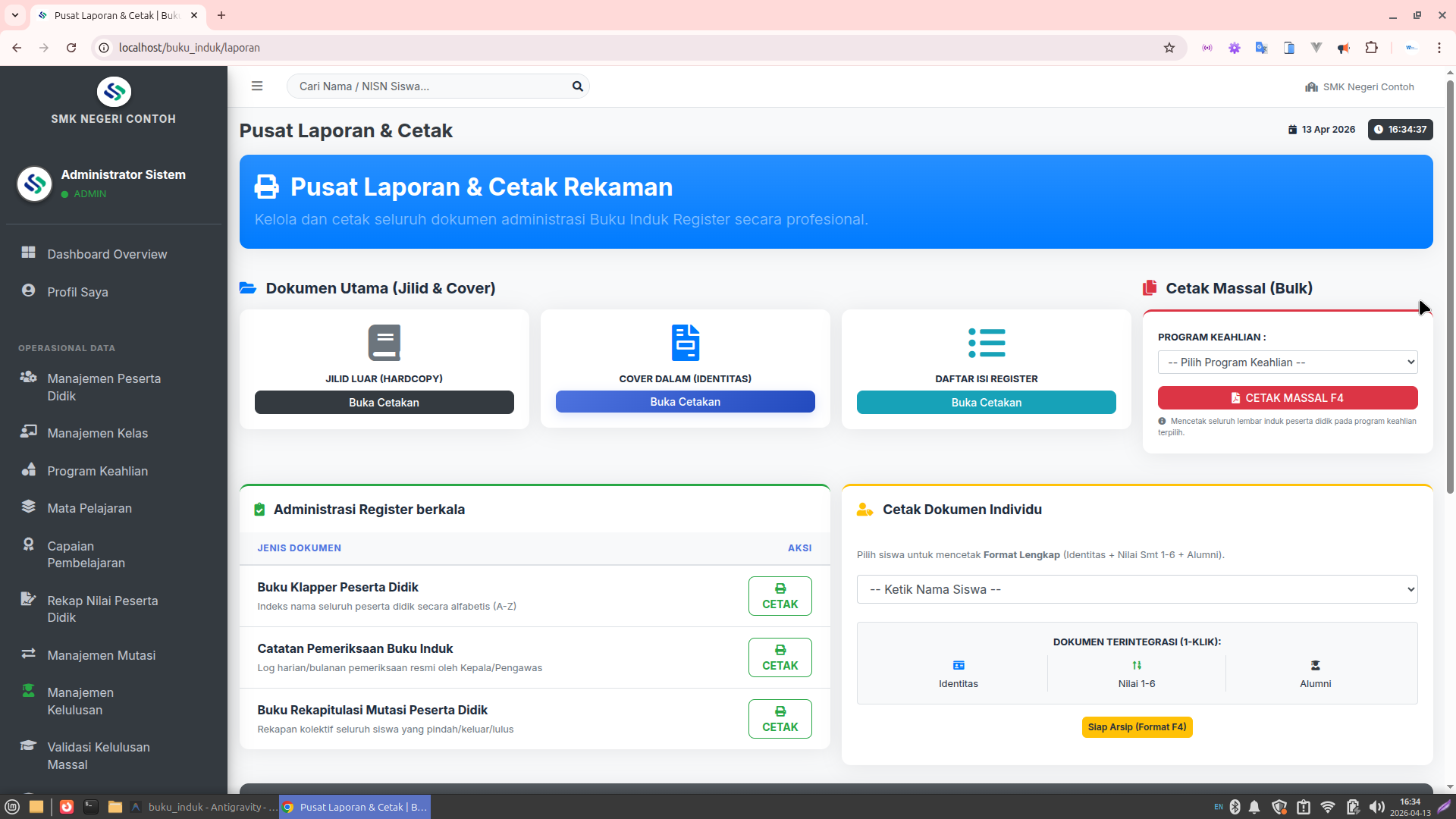 Cetak Massal (Bulk): Mencetak lembar induk seluruh peserta didik per jurusan hanya dengan satu klik.