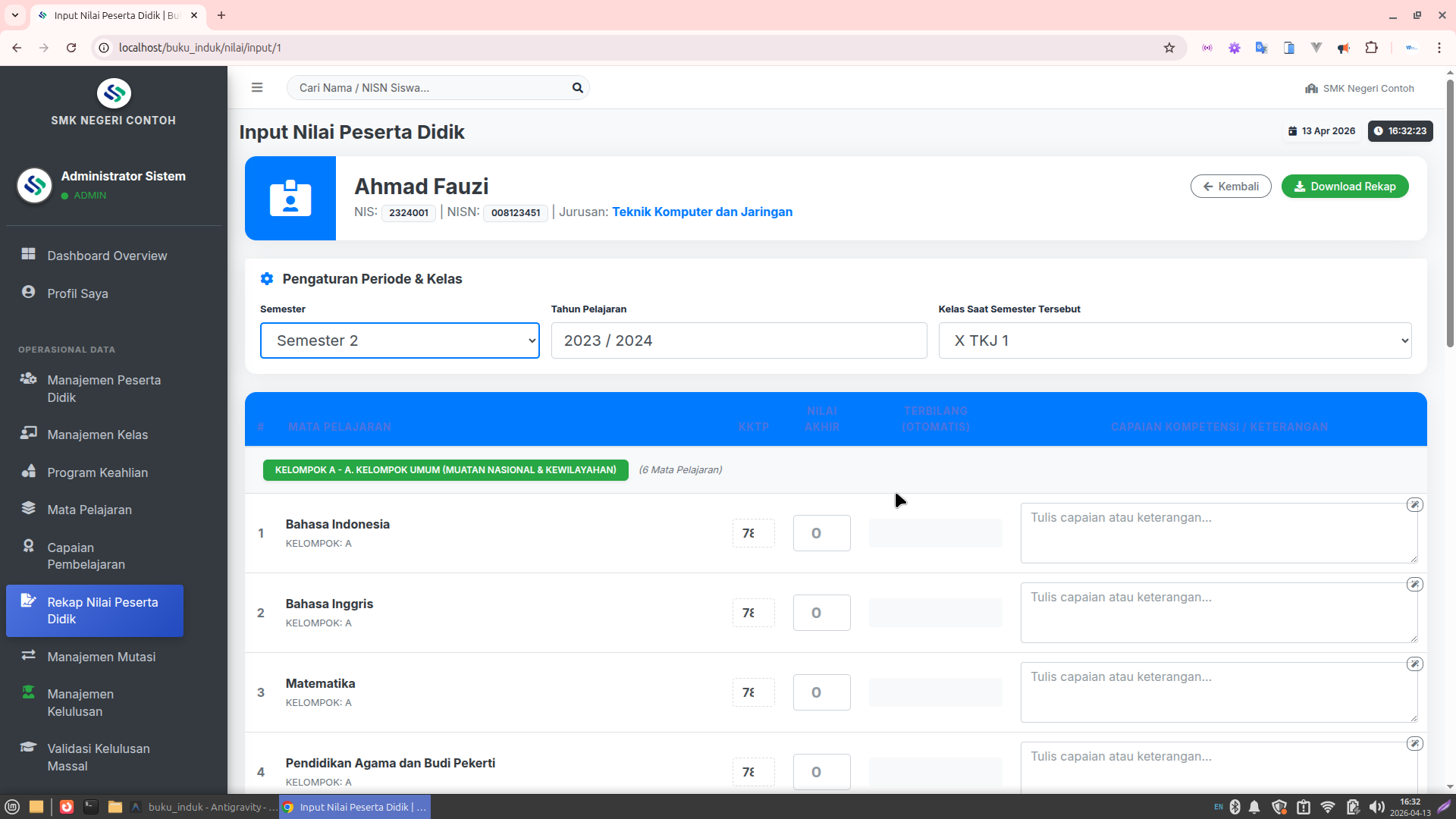 Daftar Nilai SMK: Rekapitulasi nilai raport 6 semester terintegrasi dengan data absensi dan ekstrakurikuler.