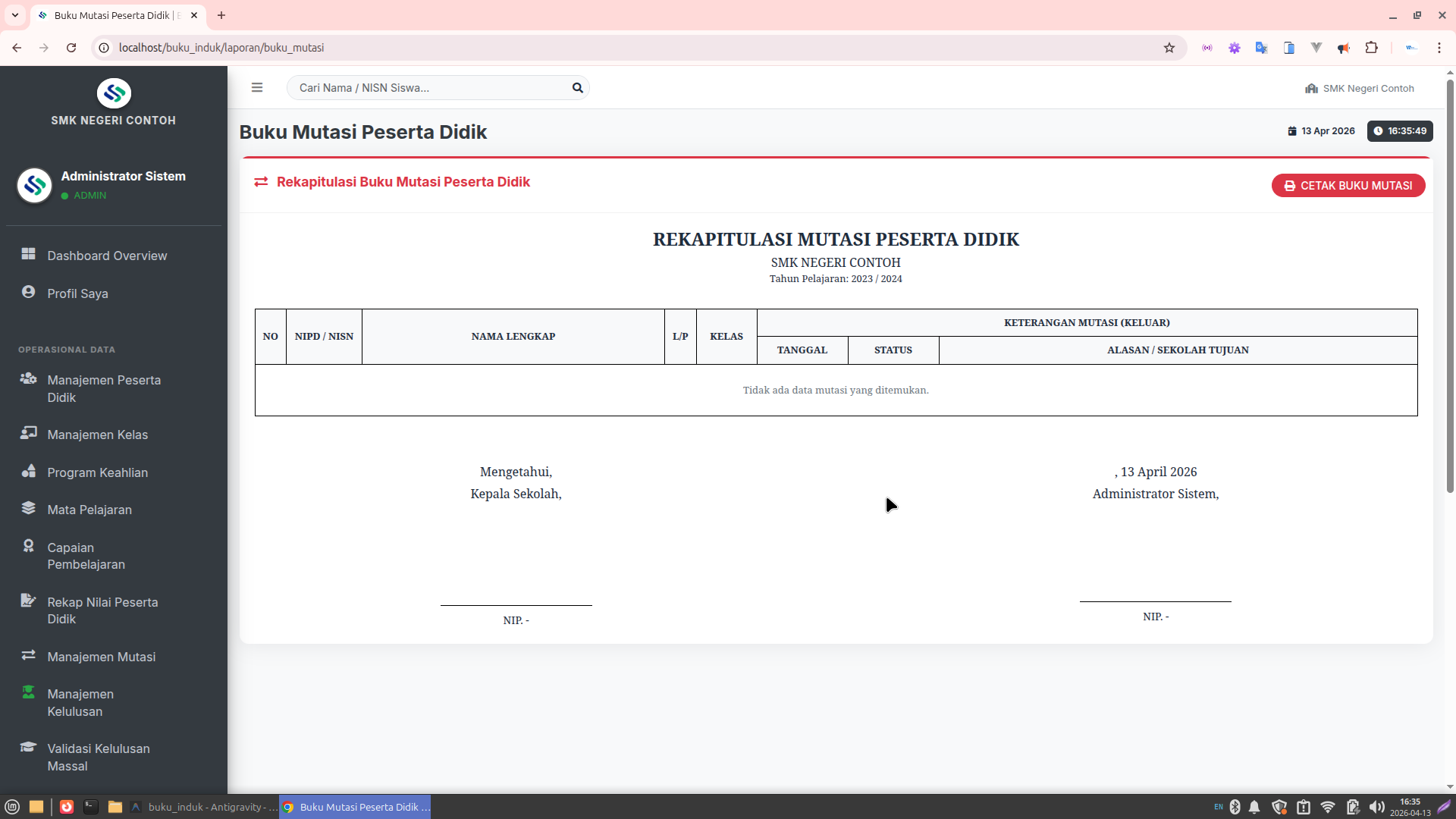 Dynamic Administrator Settings: Nama, NIP, dan Jabatan penanda tangan laporan dapat diatur secara terpusat melalui panel konfigurasi, memastikan seluruh laporan (Rapor, Surat Pindah, Lembar Induk) memiliki data pejabat yang konsisten.